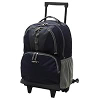 My son asked for a rolling backpack this year because he had difficulty carrying his backpack loaded with books last year due to their weight and his small frame. I bought two of these backpacks for my twins. They arrived separately and one box came all banged up, eventhough the backpack was a little dirty it was fine. Going on week two of use, I have no problems with them. Actually, I love them. They are roomy enough to carry several books, lunchbag and a sweatshirt with some room remaining. It is well designed that there is no problem with it tipping over. No issues with the pull up handle either. Have not tried using it as a regular backpack because my kids enjoy rolling it around too much. Would have given it 5 stars but since this is only week two of use, I can't talk to its durability. Excellent buy at a good price. If it holds up, I will definately buy again.This backpack is big enough for a binder and several textbooks. It's holding up well to day-to-day life with a kid. It's not the most attractive in the world, but it gets the job done.Update 3/25/11 We had to replace it before the end of the school year. It didn't have staying power. By the time we threw in the towel, the legs on the bottom were broken, and the bottom seam was ripped out. We limped it along as long as we could. By mid-March, it was obvious that we weren't going to make it until the end of May.
